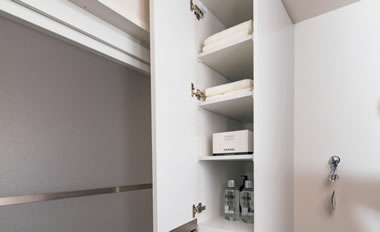 タオル類や小物などを整理できる収納を設置。すっきりと整理された美しい洗面室を演出します。※タイプにより仕様が異なります。