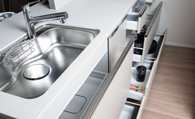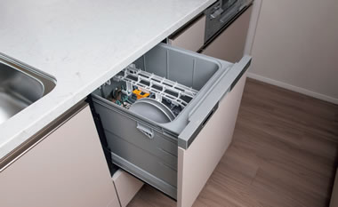 後片付けの手間を減らせ、食器の出し入れも楽な姿勢で行えるスライドオープンタイプの食器洗い乾燥機を採用しています。