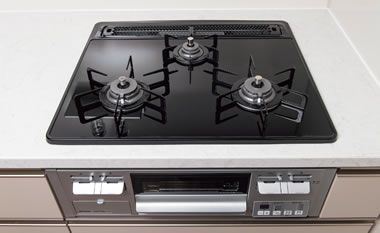 温度調整機能とダブル高火力&ダブルトロ火機能を搭載した3口ガスコンロを採用。3口なので効率的な調理が可能です。