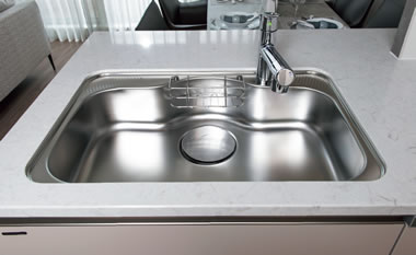 大きな鍋もゆったり洗えるシンクは、シンク制振材の効果によりシンクの水ハネの音を軽減します。
