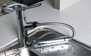 レバーひとつで浄水と水道水の切り替えが可能。シャワーヘッドを引き出して、シンクのすみずみまで洗えます。