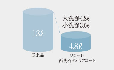 環境にやさしく、しかも経済的。洗浄使用量は大4.8ℓ/小3.6ℓと従来品に比べ約70%の節水を実現。水道料金を節約できます。