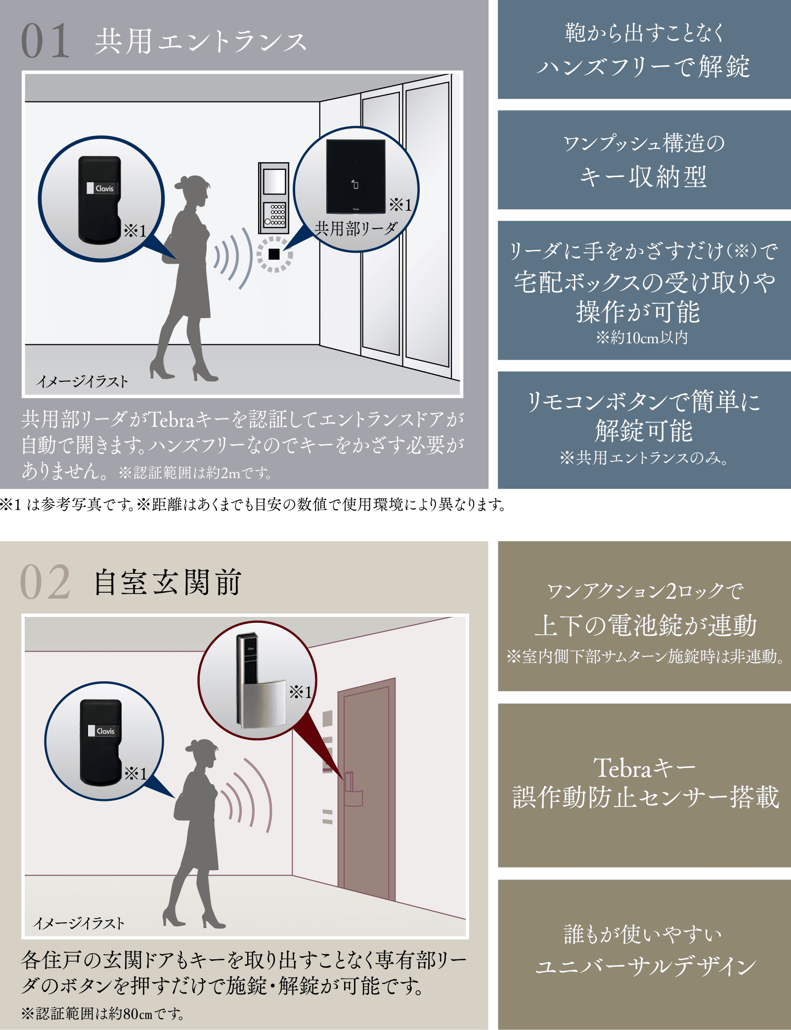 各邸の玄関ドアの開閉もTebraキーを携帯したまま専有部リーダの施錠・解錠ボタンを押すだけ。