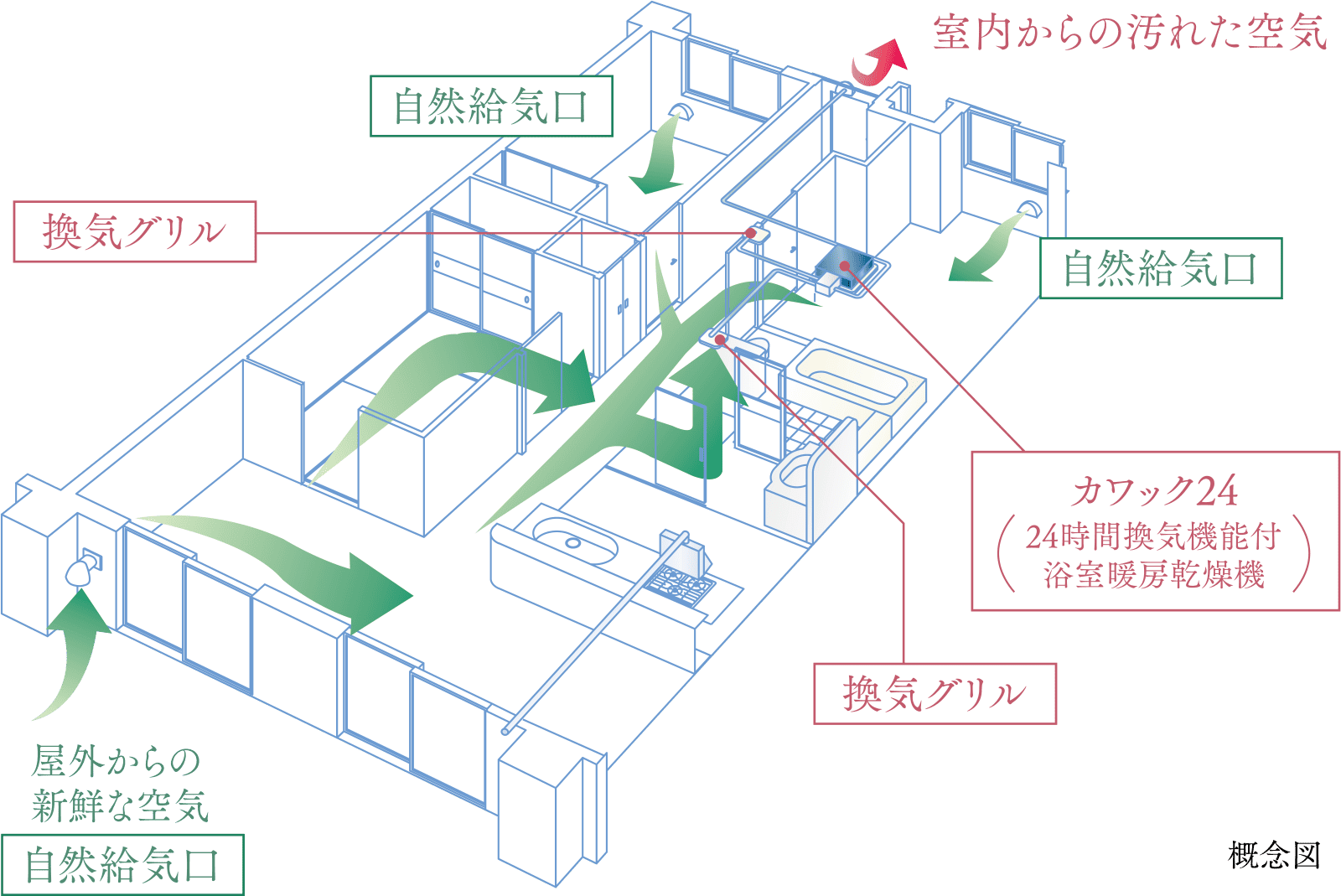 各居室等(一部除く)に設けられた自然給気口から外部の新鮮な空気を取り入れ、汚れた空気や二酸化炭素、湿気などを排出する24時間換気システムを採用。浴室暖房乾燥機を利用したシステムで、少風量の空気の流れを住まいの中につくり、健康的な室内環境を演出します。。