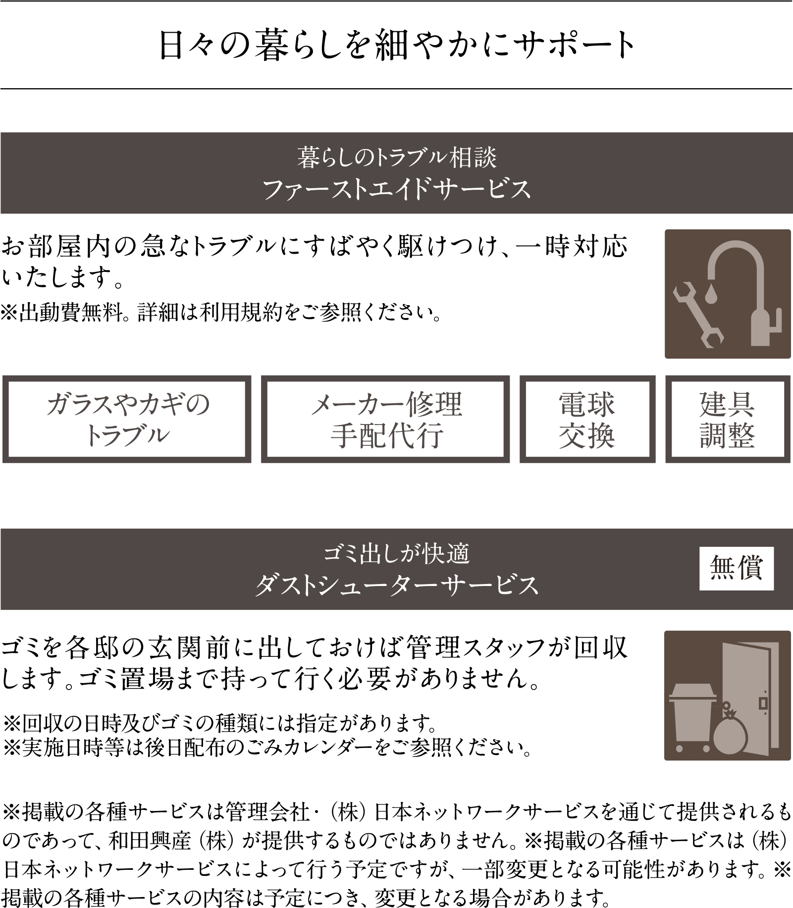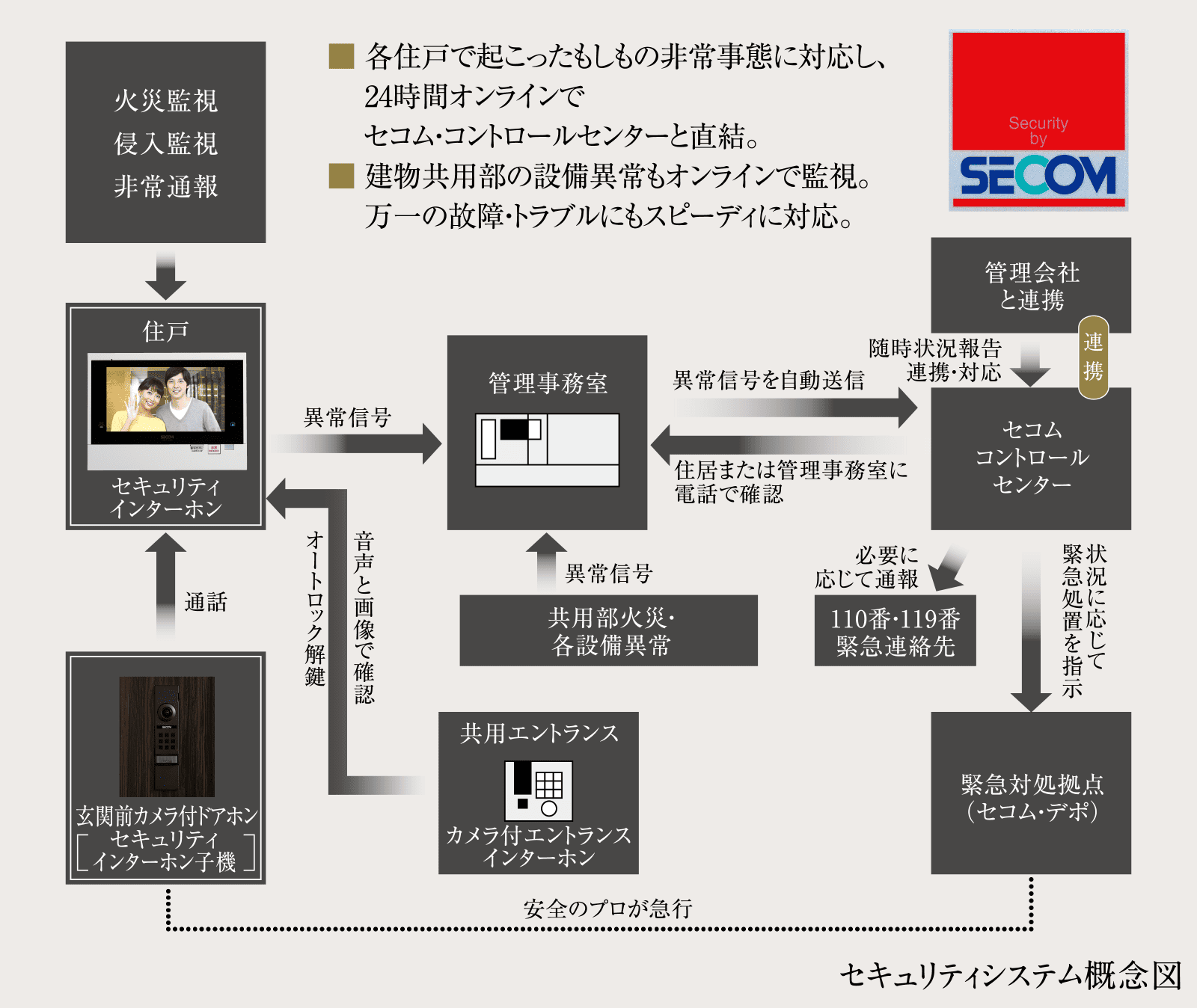 24時間・365日休むことなく暮らしを見守るセコム・マンションセキュリティシステムを導入。万一、各邸の玄関ドア・窓に設置された防犯(マグネット)センサーが非常事態を感知した場合、またはリビングのセキュリティインターホンに内蔵されている非常ボタンを押した場合、電話回線を通じてセコム・コントロールセンターへ自動通報。管理スタッフが不在でもオンラインで直結し、安全のプロが迅速に対応。必要に応じて警察・消防などに連絡します。