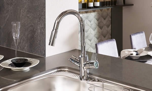 スタイリッシュなフォルムと高い浄水能力を兼ね備えた水栓。レバーで水・お湯を手軽に切り替えることができ、ハンドシャワー機能も備えています。