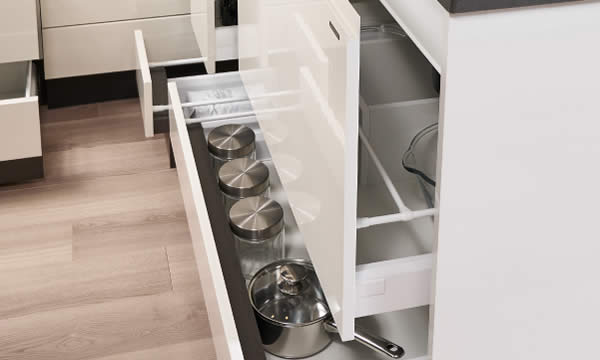 シンプルなデザインのキャビネットは、重い引き出しも軽く開閉できるアーキテックレールを採用。静かにスムーズに閉まります。