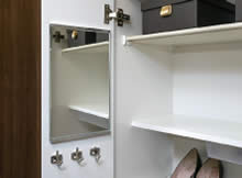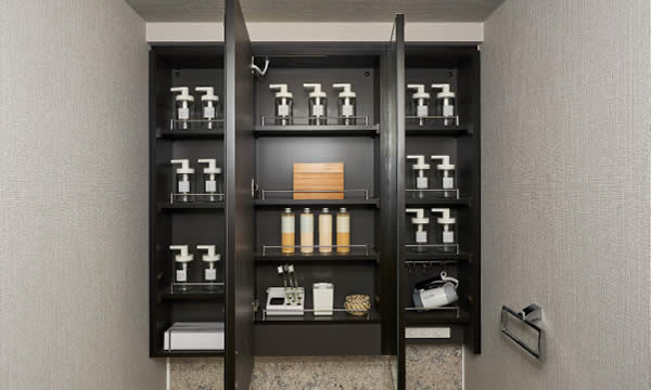 中央と左右、すべてのミラー裏面が収納棚の豊富な収納力。ドライヤーやティッシュボックスも専用の置場にすっきり収納できます。