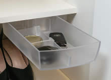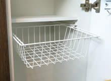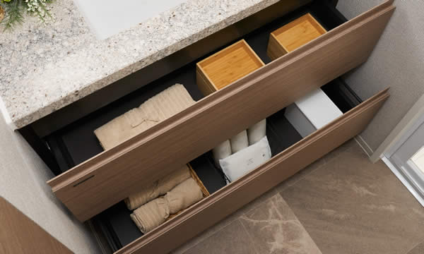 引き出し中箱の形状を凹型にすることで排水管等の干渉をさけて有効に収納できるキャビネット。アーキテックレールを採用したスライドタイプです。