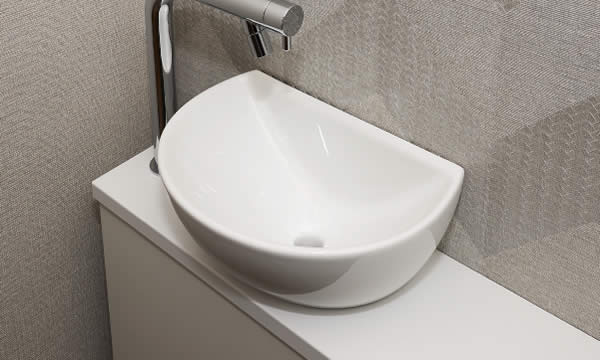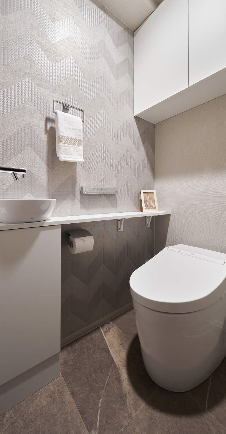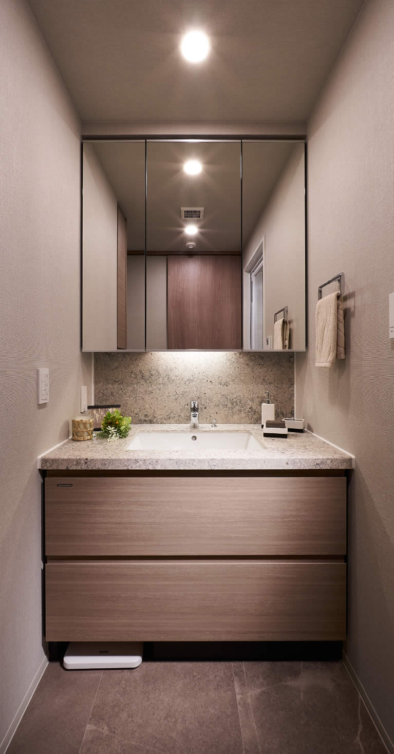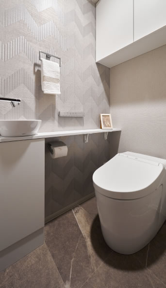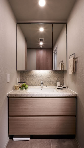 専用の手洗いカウンターは、スマートな省スペース設計。下部にキャビネットを設置しています。