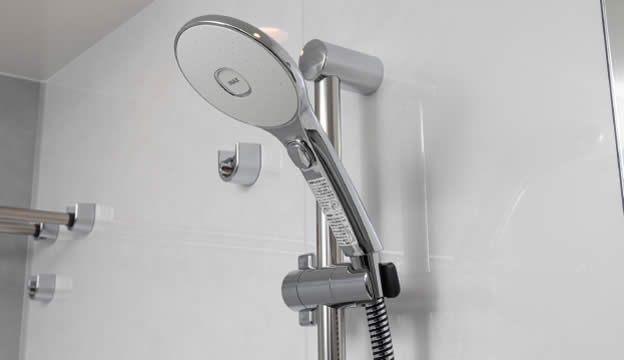 高級感のある直径11cmのシャワーヘッドは手元で止水・吐水をすることで従来品より節水が実現。シャワーヘッド位置の高さが調整できるスライドバー付です。