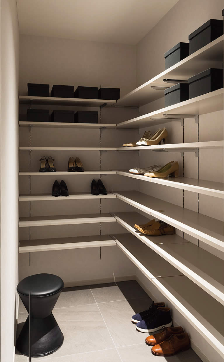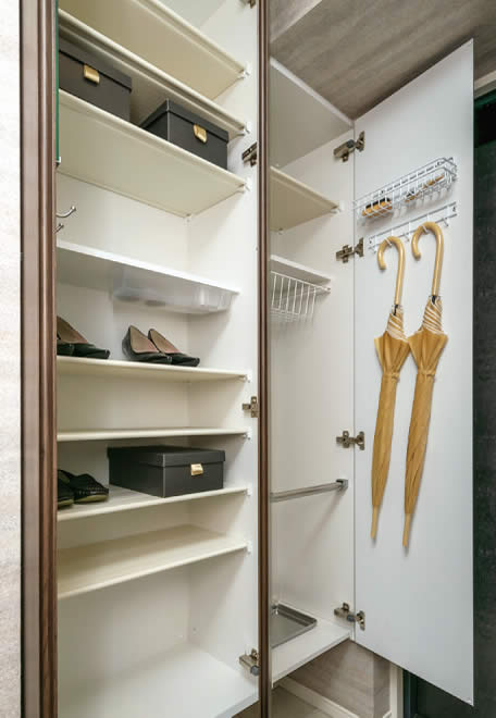 たっぷりと収納できるトールタイプのシューズボックスは、ご家族の靴はもちろん、傘立てや印鑑などの小物を収納するのに便利な回転トレー、ラック、フックなどを標準装備しています。