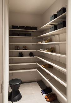 靴を余裕で収納できる大容量のシューズインクローク。ゴルフバッグやキャリーケースなども入る大きな収納スペースです。