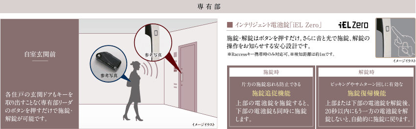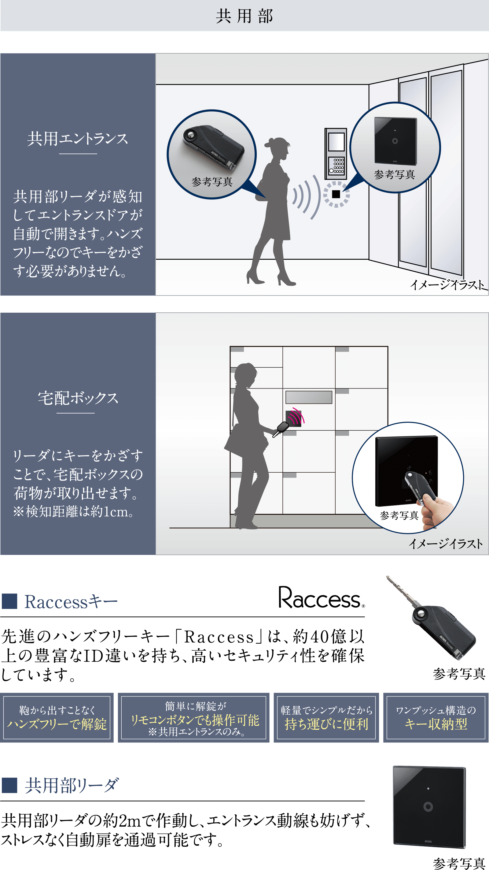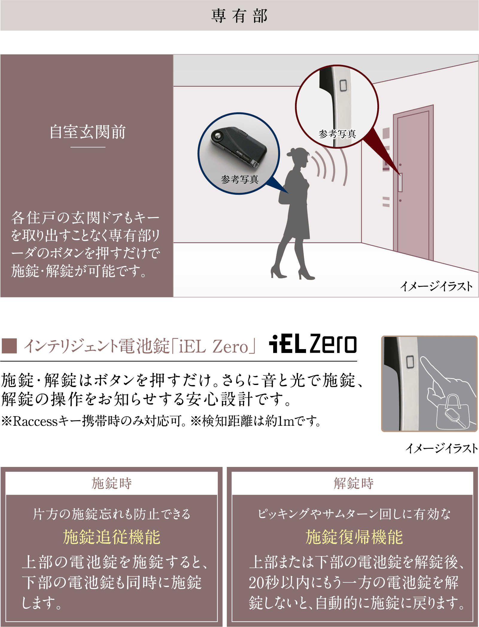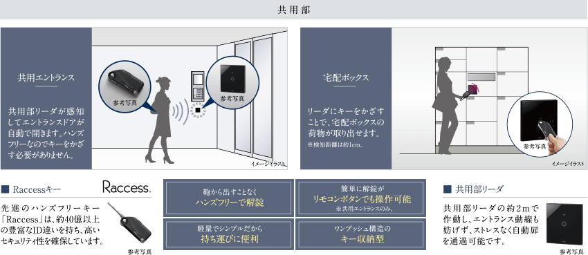 バッグなどにキーを入れたままオートロックを自動解錠できるハンズフリー錠。各邸の玄関ドアもキーを携帯したままリーダのボタンを押すだけ。高いセキュリティ性と快適性を両立した先進システムです。