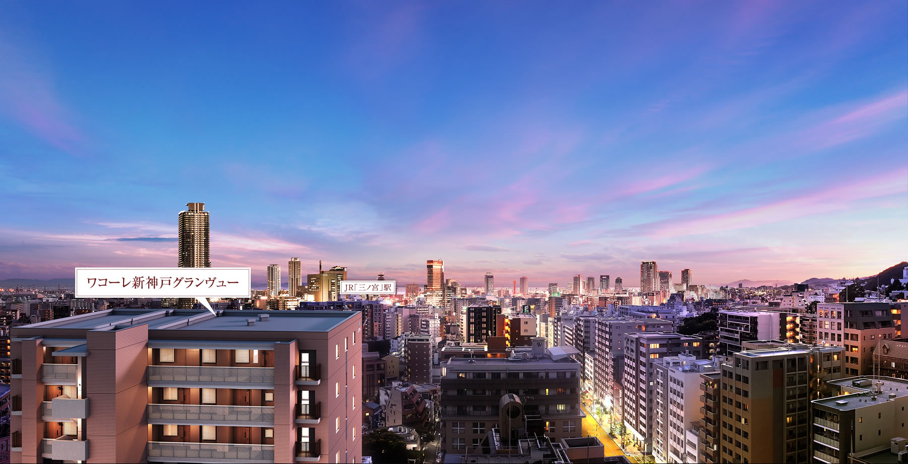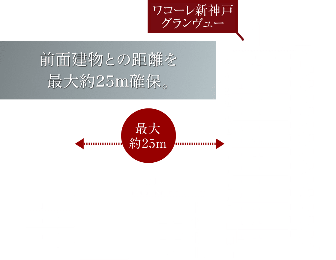 全面建物から最大約25mを確保したゆとりの配棟計画で、都心居住でありながらも圧迫感の少なさが「ワコーレ新神戸グランヴュー」の魅力です。都心居住の新たな邸宅品質を目指しました。