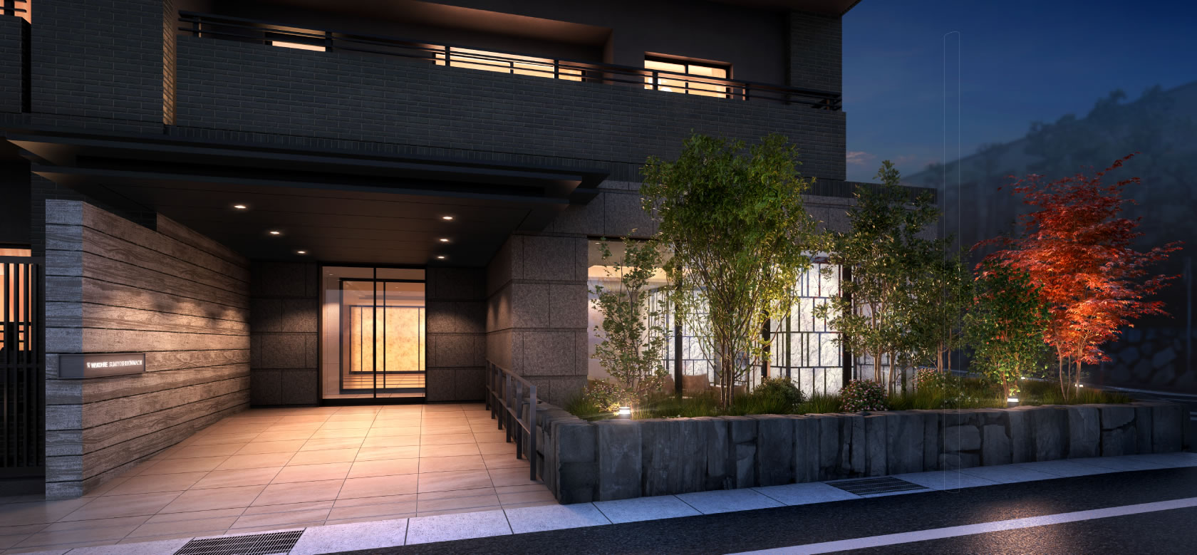植栽を幻想的に照らす間接照明と建物内から零れる灯りがオーナーをやさしく包み込みます。