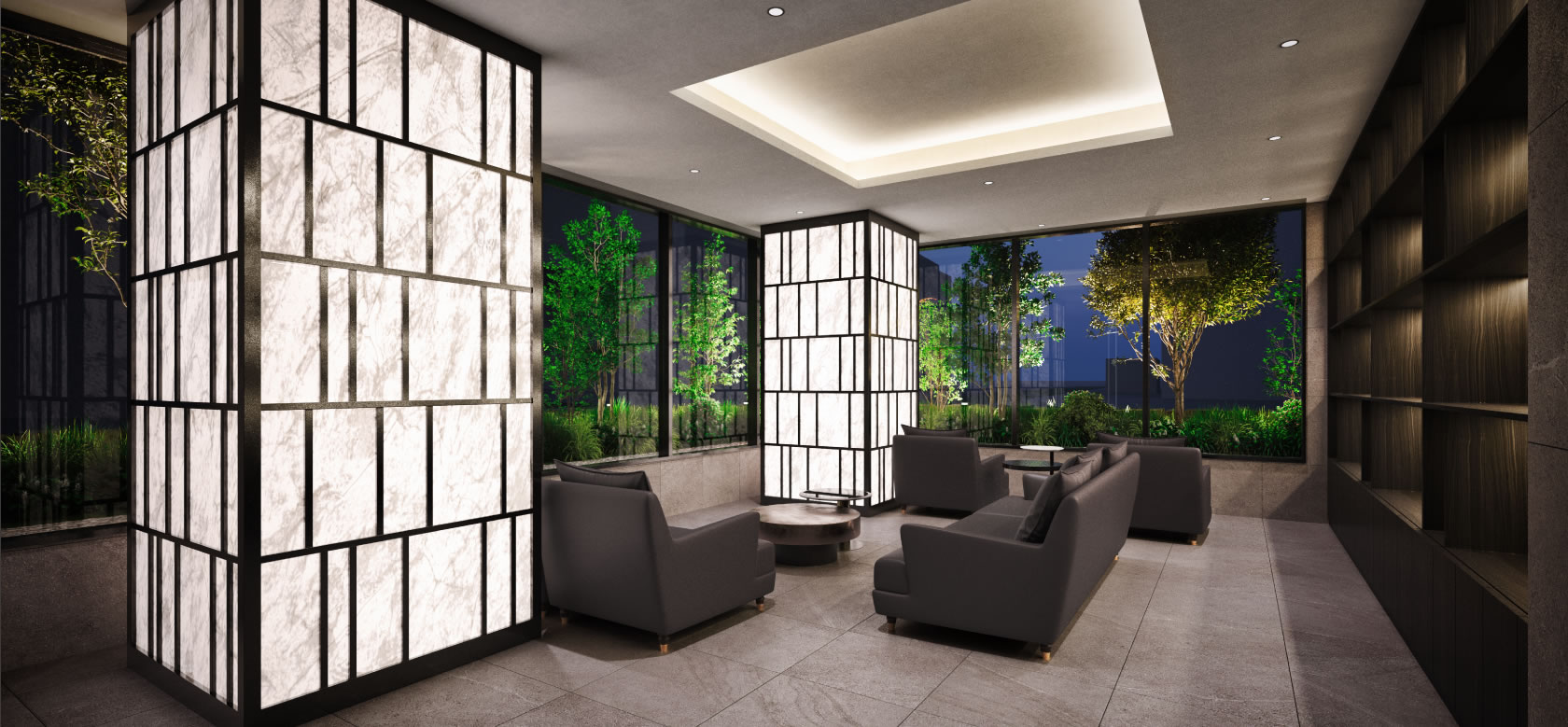 穏やかに輝くライトストーンの光柱、シックな木調カラーでまとめた壁面の光棚が