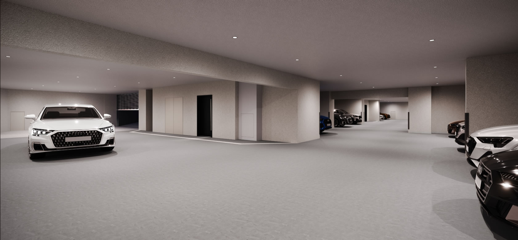雨風や直射日光から大切な愛車を守る地下1階の屋内平面駐車場。