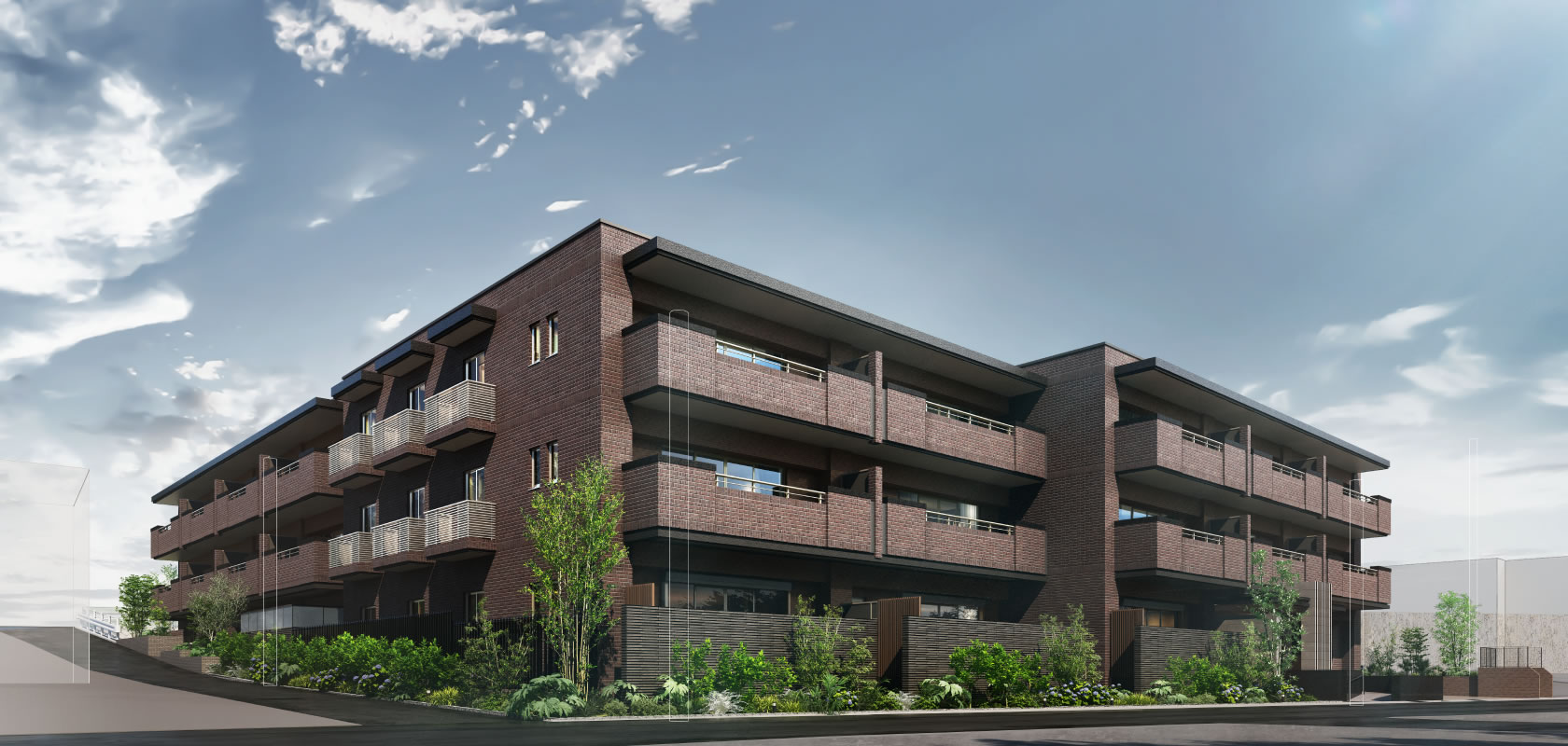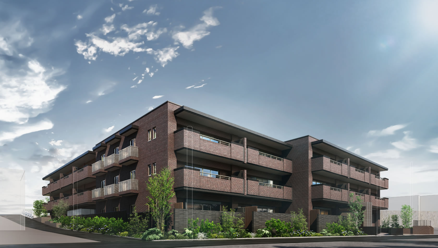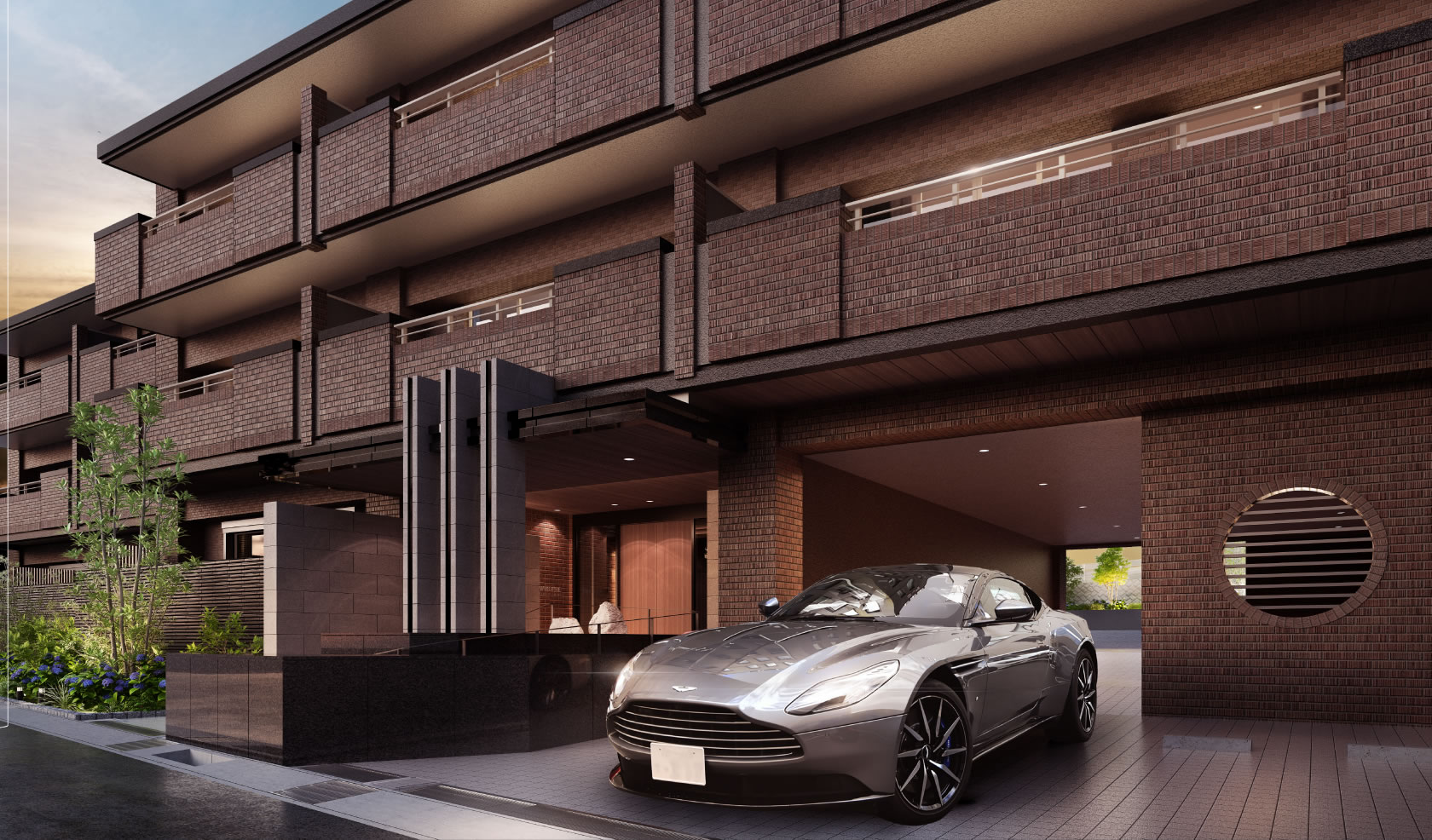 数々の名建築が静かに物語るそんな美学を継ぎ、時を経ても色褪せない美しさを纏う佇まいは、ダークブラウンのレンガ調二丁掛タイルを基調に、基壇部には繊細な陰影を描くボーダータイルを採用し、本物の風格と存在感を放つ佇まいを描き出します。